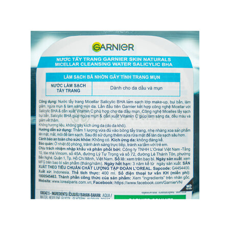 Garnier Skin Naturals Salicilyc BHA Cleansing Water là dòng sản phẩm nước làm sạch và tẩy trang đa năng được thiết kế chuyên biệt dành cho da dầu & mụn, giúp làm sạch hiệu quả mà không gây kích ứng hay tổn thương cho làn da của bạn. Với công dụng chăm sóc da 3 trong 1, bạn có thể sử dụng Garnier Micellar Water như một sản phẩm làm sạch da, toner hoặc tẩy trang. Sản phẩm dùng được cho da mặt, mắt & môi.